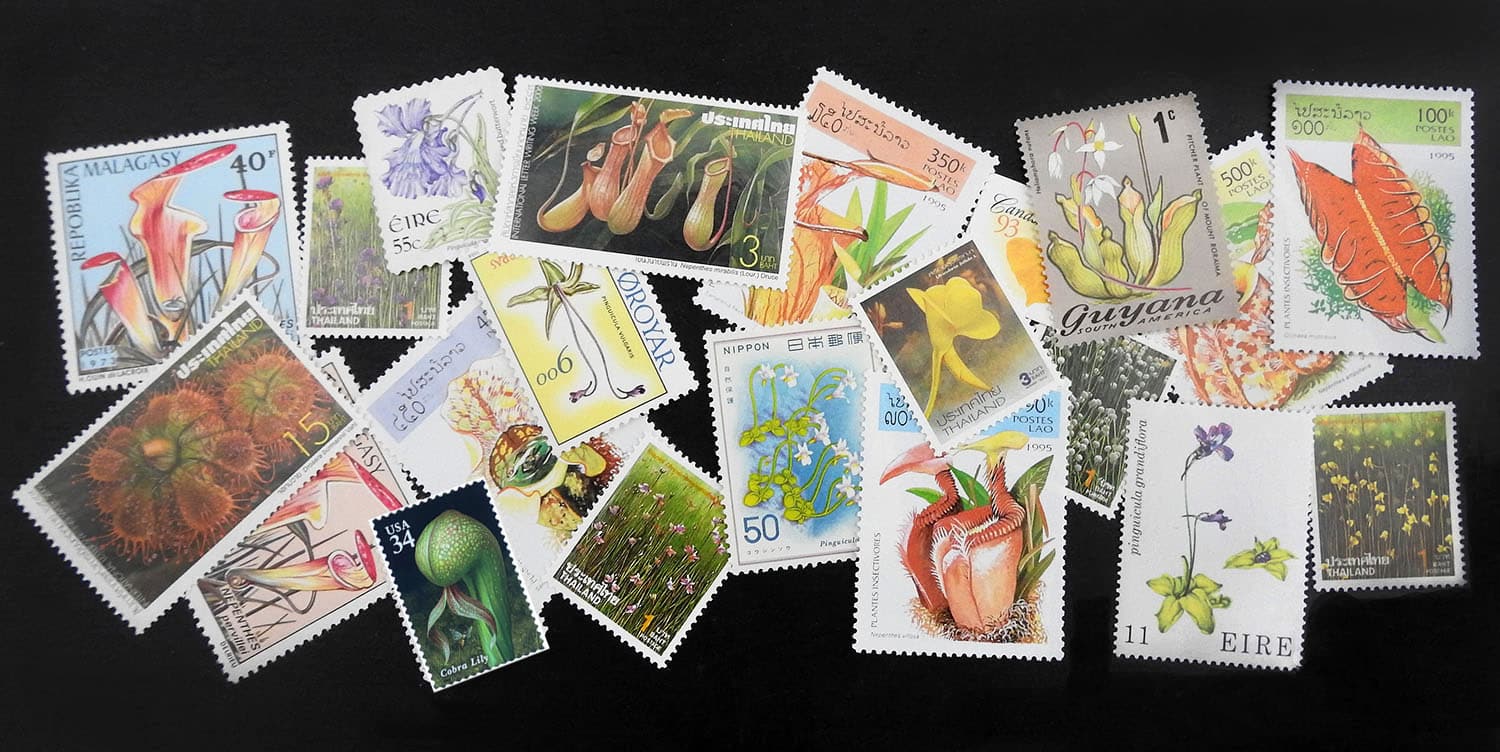 Denne side viser frimærker med kødædende planter som motiv ledsaget af noter om både frimærker og planter. For en mere detaljeret beskrivelse af carnivori og de forskellige slægter henvises til siden Kødædende planter. Der er udgivet over 34.000 frimærker med blomstermotiv, men kun godt og vel 100 med kødædende planter ifølge Michel kataloget, der dækker hele verden fra 1874 til dato. Der er f.eks. flere tusinde orkidé frimærker. Det har ved lanceringen af denne side ikke været muligt at fremskaffe samtlige frimærker med kødædende planter, men flere forventes tilføjet med tiden.