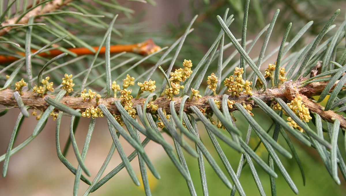 Arceuthobium med ca. 42 arter er den mest avancerede slægt i Viscaceae, hvor langt de fleste arter hører hjemme i Nordamerika. Der er en enkelt art A. oxycedri i Europa, og den når helt til Himalaya. Det er meget små hemiparasitiske stængelparasitter med hun- og hanplanter, der har meget stor effekt på værtens morfologi og anatomi. Herover vises to amerikanske arter t.v. A. camylopodum med næsten modne frugter på Abies magnifica (Foto: R Scharpf) og t.h. A. douglasii med hanblomster på Pseudotsuga menziesii.