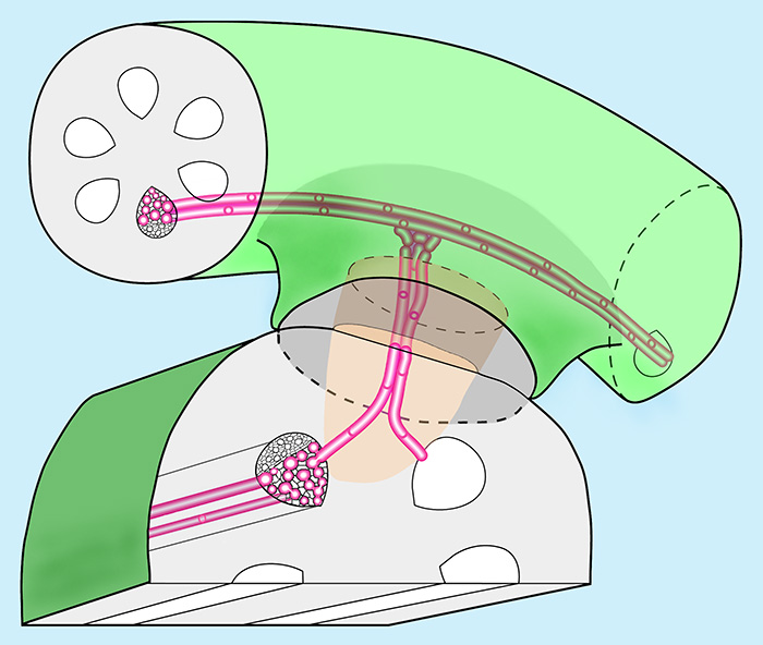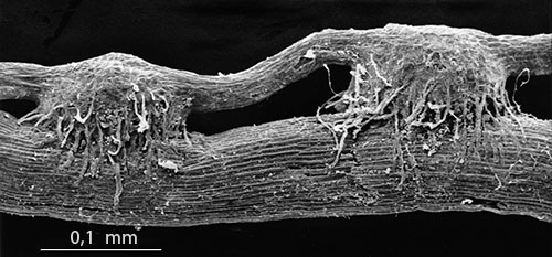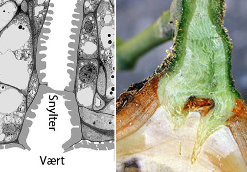 T.v. ses kraftig blomstring hos Cuscuta europaea efter angreb på Rejnfan (Tanacetum vulgare). Arternes hurtige vækst i begge slægter kan tilskrives det store antal haustorier, hvor begge anlægger en xylembro med åben kontakt til værtens ledningsvæv (se Cassytha øverst på siden). Hos Cuscuta sker der yderligere det, at xylembroens kontaktceller (som vist herover) invaderer værtens vandledende tracheider (kendes på de spiralformede afstivningslister på cellevæggens inderside).