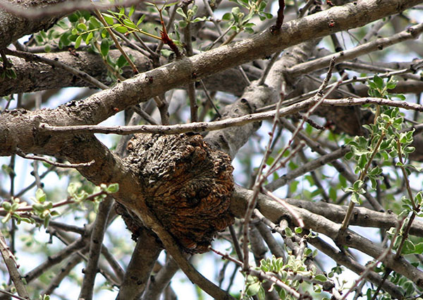 Parasittens størrelse og vægt kan resultere i, at værtsgrenen ikke kan bære den, og risikoen øges, når flere parasitter sidder på samme gren, og hele værten kan eventuelt vælte i stormvejr. T.v. er det australske Amyema pendulum på Eucalyptus sp. (Foto: G. glatzel). Vægten af en enkelt plante kan blive over 10 kg. T.h. er det amerikanske Phoradendon californicum på Cercidium microphyllum (Foto: D. Leatherman). Den kan nå 1–3 m i diameter og op til 4 m i udstrakt størrelse, hvor vægten så kan blive over 30 kg. Her kan så også nævnes en positiv effekt ved store og tætte Loranthacéer, idet fugle her kan få mad (nektar, frugter), skygge og redesteder.