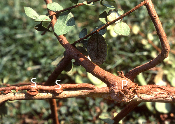Haustorier kan variere meget i både form, størrelse og antal. T.v. ses et meget stort primært hausorium udviklet direkte fra kimroden hos Loranthecéen Erianthemum ngamicum fra Sydafrika. Bemærk hvor tynd værtsgrenen er på ydersiden af haustoriet som et tegn på, hvor effektivt haustoriet har drænet værten for vand og næring. T.h. ses både primært haustorium (P) og sekundære haustorier (S) anlagt fra en epicortikal rod (adventiv rod fra stænglen) hos Notanthera heteropylla (Foto: J. Kuijt).