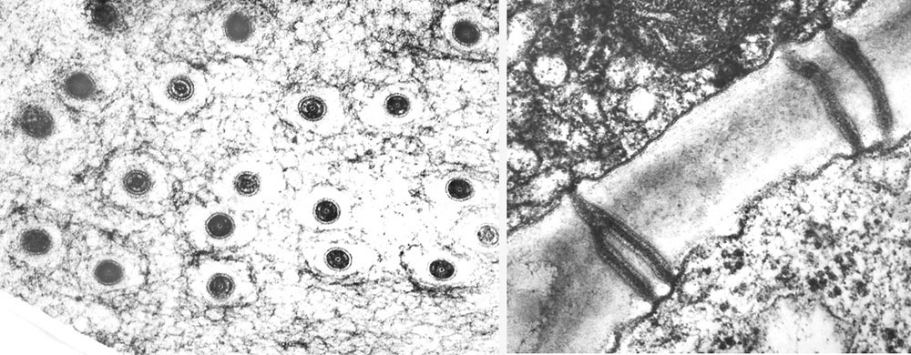 T.v. er en hæfteskive fra Cassytha pubescens gjort fri af værten, og et kileformet intrusivt organ er brudt frem. T.h. sidder hæfteskiven på værten, og det intrusive organ er vokset frem fra hæfteskivens indre, hvor flere cellelag er presset sammen under organets vækst.
