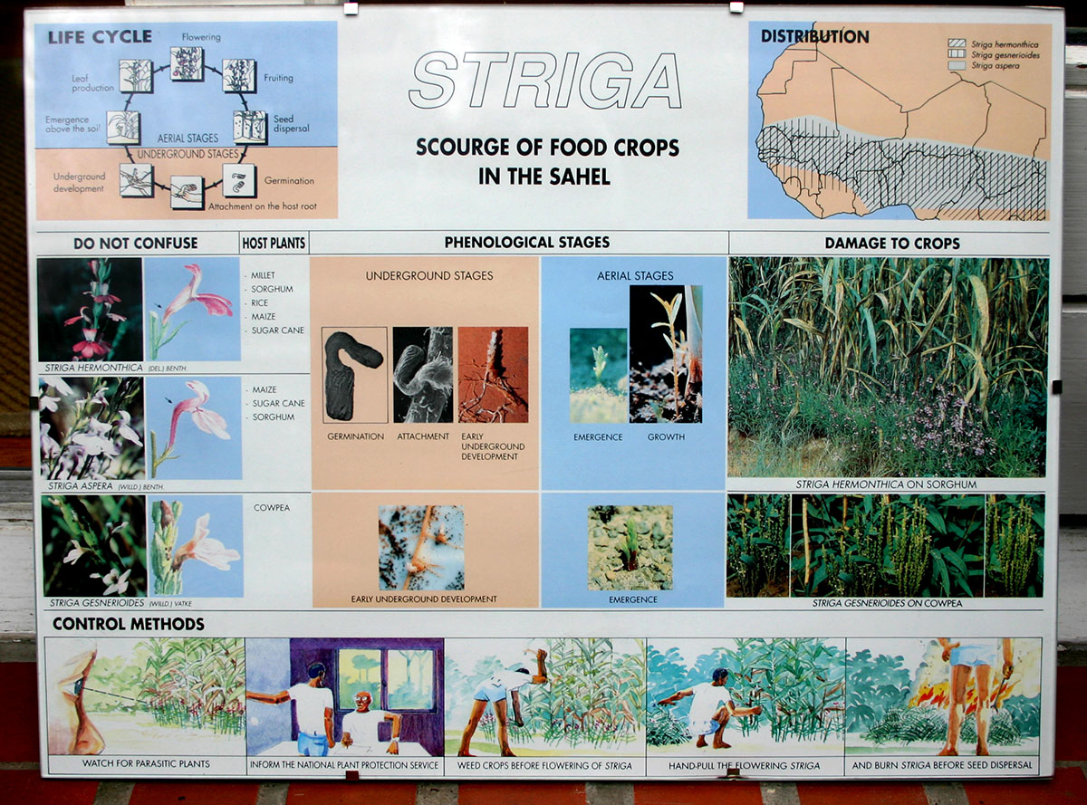 Afslutningsvis ser det ud til, at ingen af ovenstående kontrolmetoder er effektive eller praktisk anvendelige som den eneste metode. Derfor har integrerede kontrolsystemer, hvilket betyder brugen af flere af ovenstående metoder samtidigt eller successivt på samme afgrøde i nogen tid været nøgleordet for bekæmpelse af rodparasitter i udviklingslande. Genetisk baseret resistens hos værterne er fortsat en af de mest ønskelige komponenter i en integreret bekæmpelsesstrategi. De grundlæggende mekanismer, der styrer resistens over for parasitiske planter, er dog langt fra fuldt ud forstået. Udover fortsat forskning er et andet punkt vigtigt, information og undervisning. Landmændene såvel som andre har brug for at lære de parasitiske arter at kende såvel som deres livscyklus. Der gøres også en indsats i den retning, og plakater som på figuren (klik for forstørrelse) er opsat i afrikanske lande i Sahel-regionen, hvor folk samles. De ser måske enkle ud, men er et nyttigt initiativ.