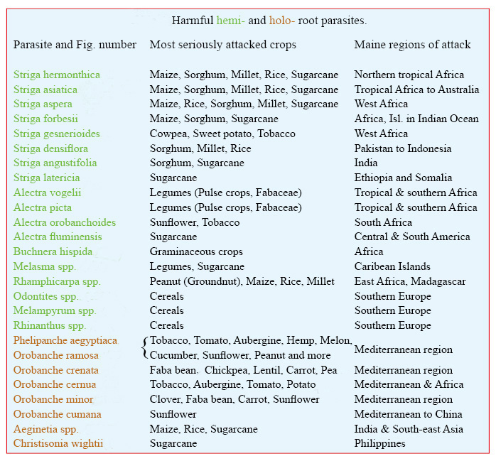 Af de omkring 4.500 arter af parasitiske blomsterplanter er det kun meget få, der parasiterer landbrugsplanter. Slægterne Cuscuta, Striga og Orobanche er de vigtigste. Ved angreb i frugtplantager og skovbrug kan stængelparasitter fra Loranthaceae og Viscaceae tilføjes, især arter af Arceuthobium. Tabellen er på engelsk, da den er taget fra min bog ’Parasitic Flowering Plants’. Tabellen angiver de værste rodparasitter, hvilke afgrøder de angriber, og i hvilke områder angreb har størst skadelig effekt. For hver slægt nævnes først den art, der forårsager flest problemer og størst økonomisk tab. Tre vigtige lærdomme fremgår af tabellen. For det første angriber langt de fleste skadelige parasitter mere end én afgrødeart. For det andet kan næsten alle afgrødearter angribes af mere end én parasitart. For det tredje undgår Latinamerika næsten skadelige parasitplanter.
