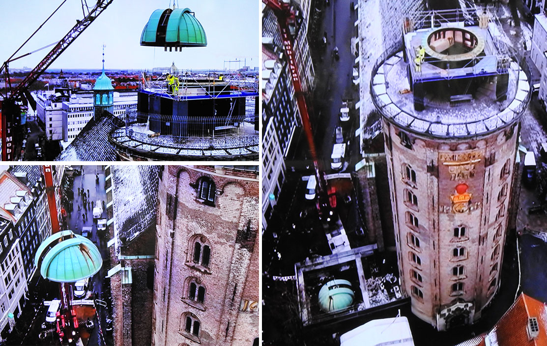 Rundetårn blev bygget efter Christian IV’s ønske og stod færdigt i 1642 som et tårn til observation af stjernehimlen. Total højden er 42,55 m, dvs. det let kan stå inde i den 79 m høje Marmorkirke. Tårnet ligger som en tilbygning til Trinitatis kirke, men har aldrig fungeret som kirketårn. Man kommer op i tårnet via en spiralgang belagt med brosten. Det betød bl.a. at Tsar Peter den store af Rusland i 1716 kunne ride op i tårnet, og tsarinaen kunne køre op i karet. Tårnet ligger i Købmagergade, der nu er gågade. – I januar 2026 blev observatoriets mere end 3 tons tunge kobberkuppel hejset ned på gaden for at få lagt nyt kobbertag på. Klik på øverste højre foto for at se processen.