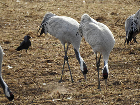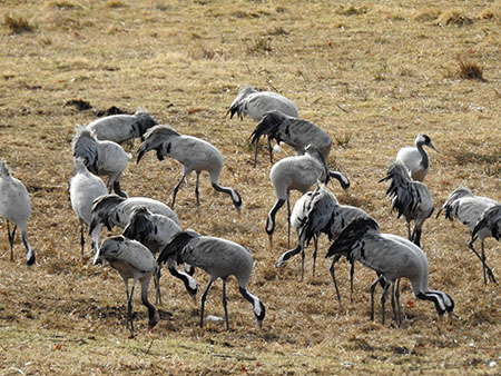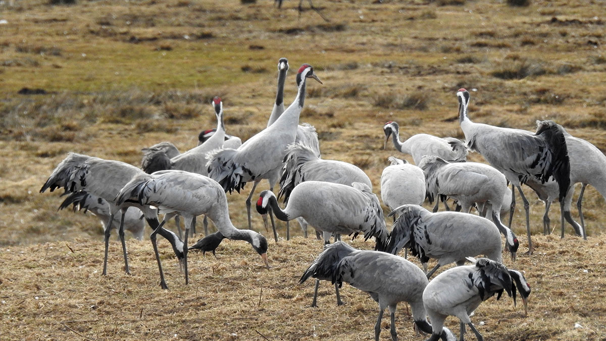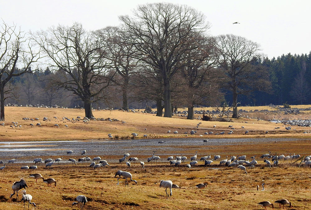 Tranerne kommer til Hornborgasjöen for at spise og hvile. Oprindeligt var det de mange kartoffelmarker, der tiltrak fuglene, men kartofler er der få af nu, så i dag fodrer man fuglene med korn.