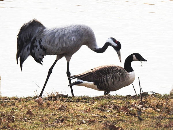 En fuldvoksen trane kan blive op til 130 cm høj med et vingefang på 2,4 m og en vægt på 6,1 kg. Den kan i naturen blive 20-25 år gammel. T.h. ses den sammen med en Canadagås.