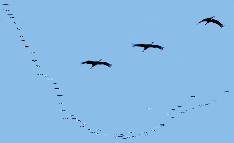 Tranetræk hen over vores hus den 2/4 2018 sidst på eftermiddagen. Vejret var med solskin og vindstille. Der er 62 fugle i den viste flok. Traner, svaner og gæs flyver i kileform for at spare energi, da vingeslagene fører til opadgående luftstrømme, som den bagved flyvende kan udnytte og spare 20-30% energi. V-formen giver desuden frit udsyn fremefter til bl.a. lederfuglen, og det giver bedre koordination ved retningsændringer, så flokken holdes samlet.