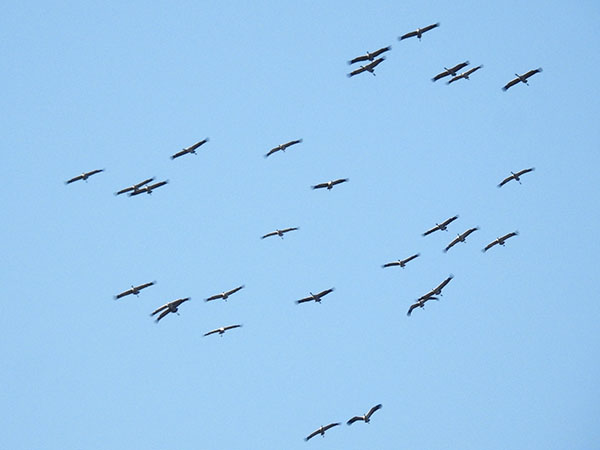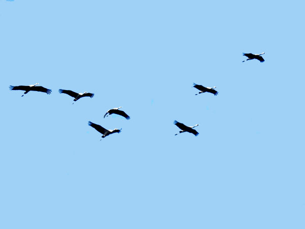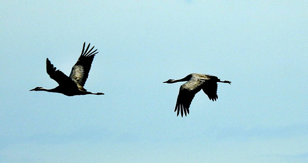 Tranen har et meget karakteristisk trompetskrig, der kan høres på flere km’s afstand, så vi er aldrig i tvivl om, hvornår vi skal vende blikket mod himlen. Fuglene tager ofte en rundtur eller to over områdets huse for at udnytte opvinde. Vi har observeret trane forårstækket i mere end 30 år og har konstateret, at det foregår tidligere og tidligere gennem årene som reaktion på klimaændringerne. I 1990erne kom det første træk i begyndelsen af april, i 2025 kom det allerede den 21. marts.